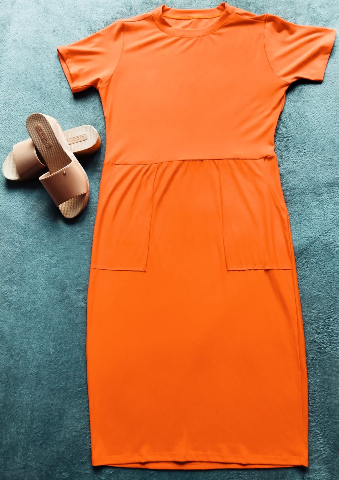 Vestido midi, justo, muito elegante e confortável. Confeccionado no moletinho, manga curta, gola redonda e possui bolsos.